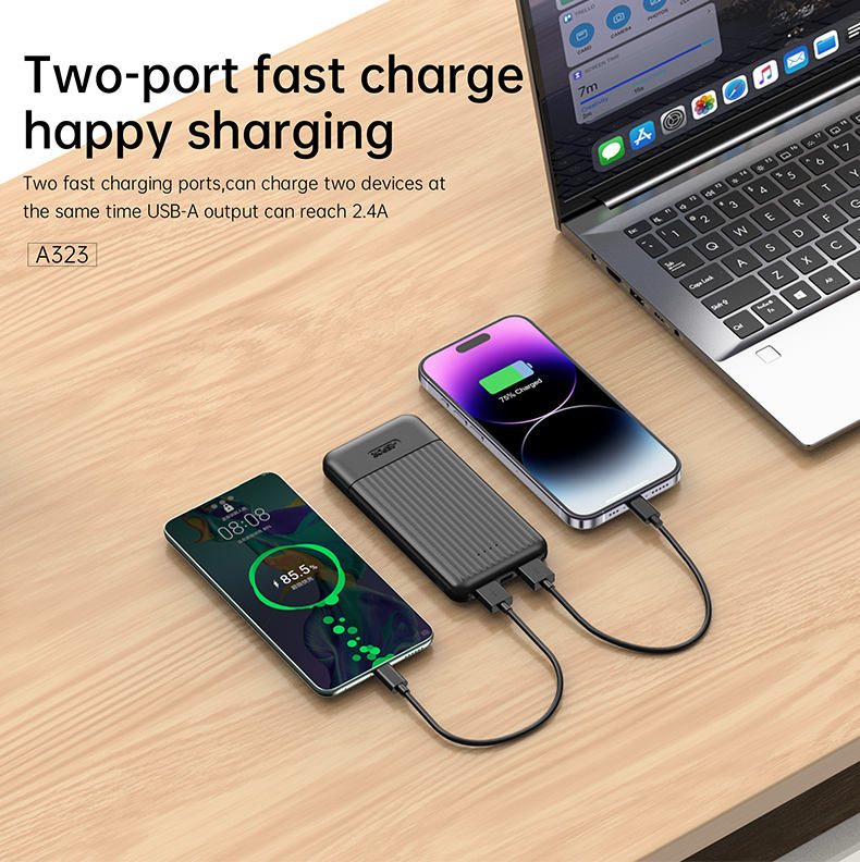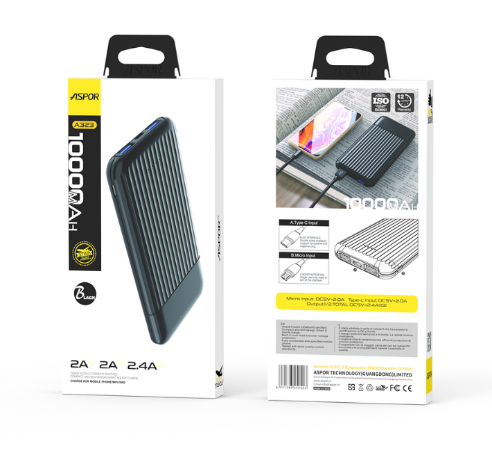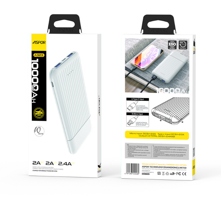 Stay powered up anywhere with the ASPOR A323 10000mAh Portable Power Bank, designed with advanced safety features, dual charging ports, and ultra-slim portability. Perfect for outdoor adventures, travel, or daily use, this high-capacity power bank ensures your devices never run out of charge.